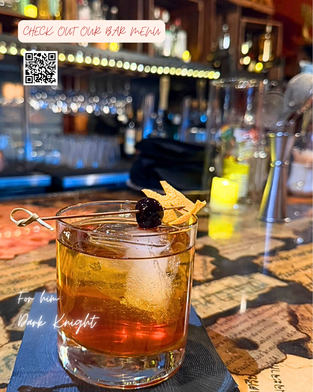 The Dark Knight: Dry Whiskey, Dashes, BW Bitters, Brown Syrup.